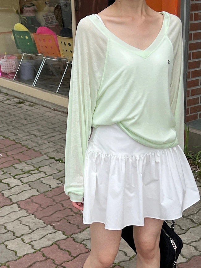 썸머 딥 브이넥 소프트 루즈핏 패치 시스루 티셔츠 | Rangbe
